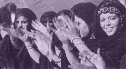 Vor allem die Frauen gelten als die Bewahrerinnen des Haul-Gesangs und des Tanzes. Mit einfacher Instrumentierung, Händeklatschen, polyrhythmisch gespielten Trommeln und tranceartigem Gesang zaubern sie eine fast mystische Atmosphäre. Nachzulesen und zu hören auf der grandiosen CD Saharauis Stimmen im Sand des Labels intuition/Nubenegra von 1998. Das Zustandekommen des Konzerts und der damit verbundenen Deutschlandreise kann schon als kleine Sensation gewertet werden. Kaum jemals ist es bisher gelungen, eine derart hochklassig besetzte Band aus dem Krisengebiet der Westsahara in Deutschland zu präsentieren und es bedarf schon guter Beziehungen zu Behörden und der Politik, um diese kurze Tournee, die nach Madrid und eben Lohmar führt, zu realisieren. In Lohmar können wir die 8 Musikerinnen in dem barocken Ambiente des Golfhotels Schloss Auel in Lohmar-Wahlscheid bewundern. Wir danken dem Golfhotel Schloss Auel, den Labels Intuition und Nubenegra für die großzügige Unterstützung bei der Realisierung dieses außergewöhnliche Konzert. |