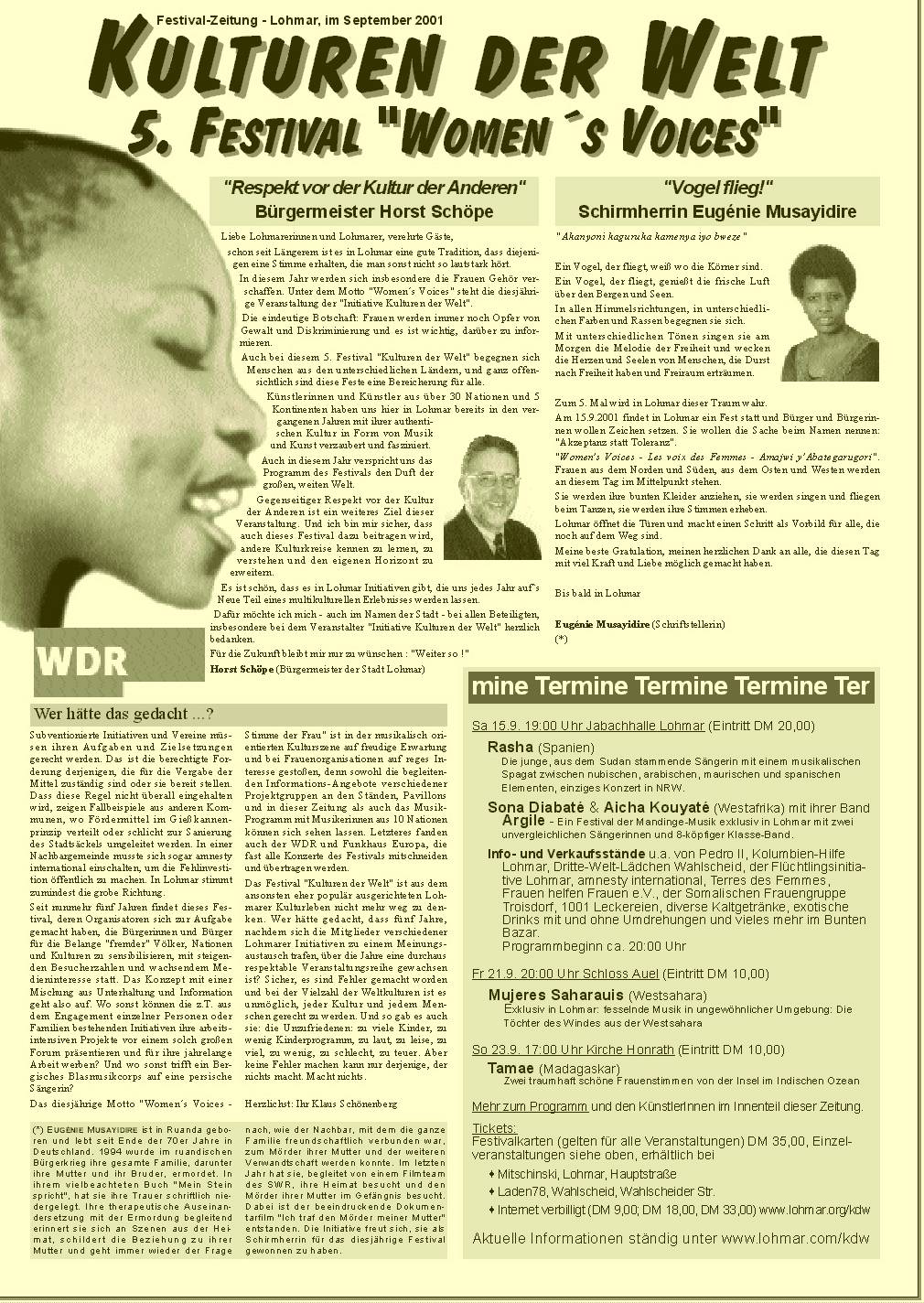Ein Vogel, der fliegt, weiß wo die Körner sind. Ein Vogel, der fliegt, genießt die frische Luft über den Bergen und Seen. In allen Himmelsrichtungen, in unterschiedlichen Farben und Rassen begegnen sie sich. Mit unterschiedlichen Tönen singen sie am Morgen die Melodie der Freiheit und wecken die Herzen und Seelen von Menschen, die Durst nach Freiheit haben und Freiraum erträumen. Zum 5. Mal wird in Lohmar dieser Traum wahr. Am 15.9.2001 findet in Lohmar ein Fest statt und Bürger und Bürgerinnen wollen Zeichen setzen. Sie wollen die Sache beim Namen nennen: "Akzeptanz statt Toleranz". "Women's Voices - Les voix des Femmes - Amajwi y'Abategarugori". Frauen aus dem Norden und Süden, aus dem Osten und Westen werden an diesem Tag im Mittelpunkt stehen. Sie werden ihre bunten Kleider anziehen, sie werden singen und fliegen beim Tanzen, sie werden ihre Stimmen erheben. Lohmar öffnet die Türen und macht einen Schritt als Vorbild für alle, die noch auf dem Weg sind. Meine beste Gratulation, meinen herzlichen Dank an alle, die diesen Tag mit viel Kraft und Liebe möglich gemacht haben. Bis bald in Lohmar Eugénie Musayidire (Schriftstellerin) |