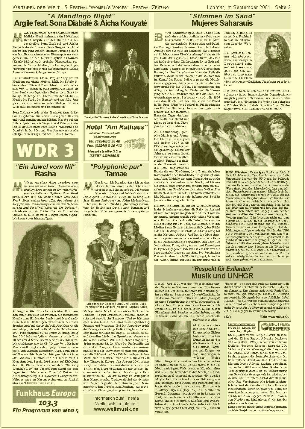 | Für das Musikprogramm und die Auswahl der Künstler ist Africa-Iwalewa, ein Musik-Magazin im Internet (www.weltmusik.de), in dem ständig sehr aktuell über multikulturelle Musikproduktionen berichtet wird, verantwortlich. Gute Kontakte zu Musikagenturen und Journalisten-Kollegen sowie Besuche der wichtigen Musikmessen (WOMEX Berlin und Rotterdam, MASA Abidjan, MIDEM etc.) erlauben einen direkten Einblick in neue Trends der Weltmusik-Branche. In diesem Jahr konnten exklusive Künstler für das Festival in Lohmar verpflichtet werden: Die in Spanien lebende Rasha kommt zu nur drei Konzerten (Frankfurt, Mannheim, Lohmar) nach Deutschland, der Auftritt der Mujeres Saharauis kann schon als kleine Sensation bezeichnet werden, da es große Anstrengung kostet, sie aus dem Krisengebiet der Westsahara nach Europa zu bringen, und kaum jemals konnten mit Sona Diabaté und Aicha Kouyaté zwei derart profilierte Sängerinnen der Malinke und Mandingo-Musik in einem gemeinsamen Konzert präsentiert werden. Zum Abschluss der "multikultinellen Festwoche" erwartet uns dann noch ein echter Ohrenschmaus, wenn die beiden Solistinnen der Gruppe Tamae aus Madagaskar die wunderbare Akustik der Kirche in Honrath zum Klingen bringen. |