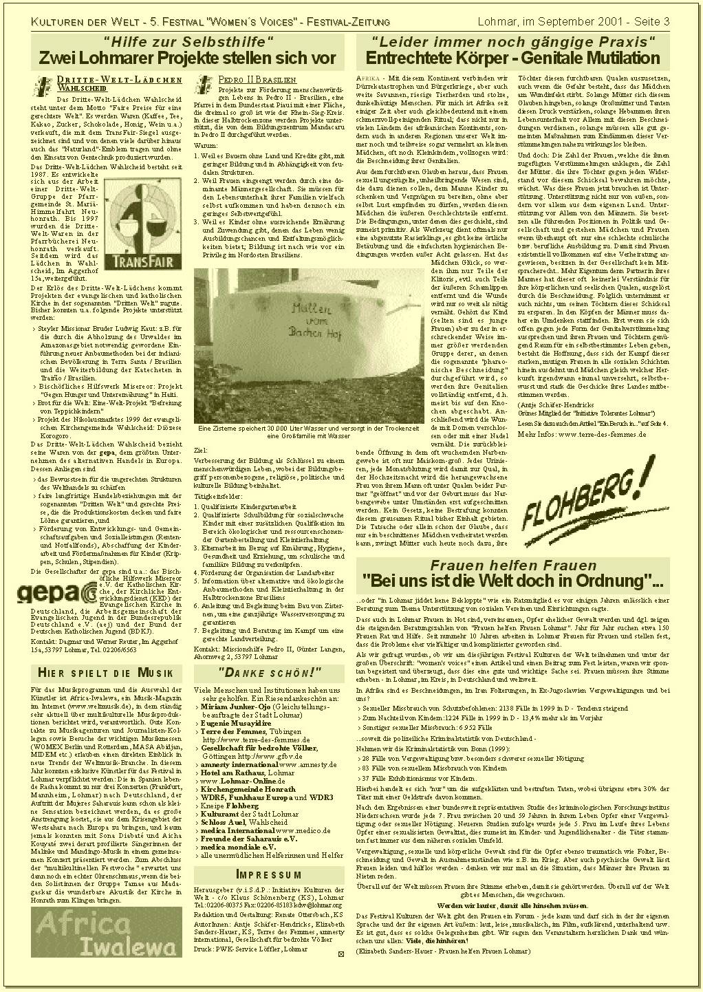 Dass auch in Lohmar Frauen in Not sind, vereinsamen, Opfer ehelicher Gewalt werden und dgl. zeigen die steigenden Beratungszahlen von "Frauen helfen Frauen Lohmar". Jahr für Jahr suchen etwa 150 Frauen Rat und Hilfe. Seit nunmehr 10 Jahren arbeiten in Lohmar Frauen für Frauen und stellen fest, dass die Probleme eher vielfältiger und komplizierter geworden sind. Als wir gefragt wurden, ob wir am diesjährigen Festival Kulturen der Welt teilnehmen und unter der großen Überschrift: "women's voices" einen Artikel und einen Beitrag zum Fest leisten, waren wir spontan begeistert und überzeugt, dass dies eine gute und wichtige Sache sei. Frauen müssen ihre Stimme erheben - in Lohmar, im Kreis, in Deutschland und weltweit. In Afrika sind es Beschneidungen, im Iran Folterungen, in Ex-Jugoslawien Vergewaltigungen und bei uns? Sexueller Missbrauch von Schutzbefohlenen: 2138 Fälle in 1999 in D - Tendenz steigend Zum Nachteil von Kindern:1224 Fälle in 1999 in D - 13,4% mehr als im Vorjahr Sonstiger sexueller Missbrauch: 6.952 Fälle ...soweit die polizeiliche Kriminalstatistik von Deutschland - Nehmen wir die Kriminalstatistik von Bonn (1999): 28 Fälle von Vergewaltigung bzw. besonders schwerer sexueller Nötigung 83 Fälle von sexuellem Missbrauch von Kindern 37 Fälle Exhibitionismus vor Kindern. Hierbei handelt es sich "nur" um die aufgeklärten und bestraften Taten, wobei übrigens etwa 30% der Täter mit einer Geldstrafe davon kommen. Nach den Ergebnissen einer bundesweit repräsentativen Studie des kriminologischen Forschungsinstitus Niedersachsen wurde jede 7. Frau zwischen 20 und 59 Jahren in ihrem Leben Opfer einer Vergewaltigung oder sexueller Nötigung. Neueren Studien zufolge wurde jede 5. Frau im Laufe ihres Lebens Opfer einer sexualisierten Gewalttat, dies zumeist im Kinder- und Jugendlichenalter - die Täter stammten fast immer aus dem näheren sozialen Umfeld. Vergewaltigung, sexuelle und körperliche Gewalt sind für die Opfer ebenso traumatisch wie Folter, Beschneidung und Gewalt in Ausnahmezuständen wie z.B. im Krieg. Aber auch psychische Gewalt lässt Frauen leiden und hilflos werden - denken wir nur mal an die Situation, dass Männer ihre Frauen zu Nieten reden. Überall auf der Welt müssen Frauen ihre Stimme erheben, damit sie gehört werden. Überall auf der Welt gibt es Menschen, die wegschauen. Werden wir lauter, damit alle hinsehen müssen. Das Festival Kulturen der Welt gibt den Frauen ein Forum - jede kann und darf sich in der ihr eigenen Sprache und der ihr eigenen Art äußern: laut, leise, musikalisch, im Film, aufklärend, unterhaltend usw. Es ist gut, dass es solche Gelegenheiten gibt. Wir sagen den Veranstaltern herzlichen Dank und wünschen uns allen: Viele, die hinhören! (Elizabeth Sanders-Hauer - Frauen helfen Frauen, Lohmar) |